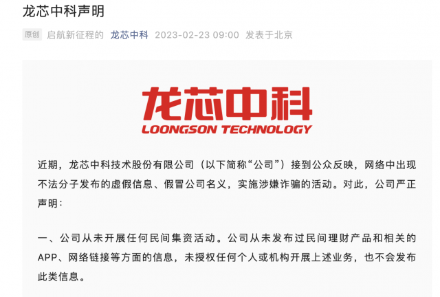 2月23日消息,近日,龙芯中科技术股份有限公司(以下简称“龙芯中科”)接到公众反映,网络中出现不法分子发布的虚假信息、假冒公司名义,实施涉嫌诈骗的活动。