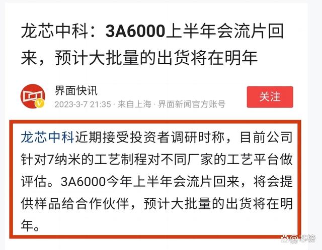 近日,龙芯中科传来好消息,自研的7纳米芯片3A6000已经有了进展,今年上半年完成流片,顺利的话明年将迎来大批量出货!