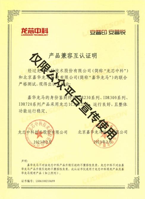 近日,北京嘉华龙马科技有限公司龙芯版-身份鉴别终端产品,IDR230系列、IDR300系列、IDR720系列产品采用龙芯1C系列芯片,经过龙芯中科技术股份有限公司和北京嘉华龙马科技有限公司的联合严格测试,运行良好且整体功能运行稳定,完成兼容性互认证。