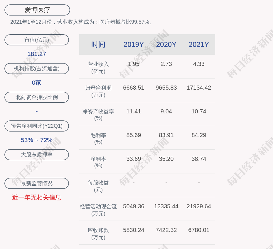 2021年1至12月份,爱博医疗的营业收入构成为:医疗器械占比99.57%。