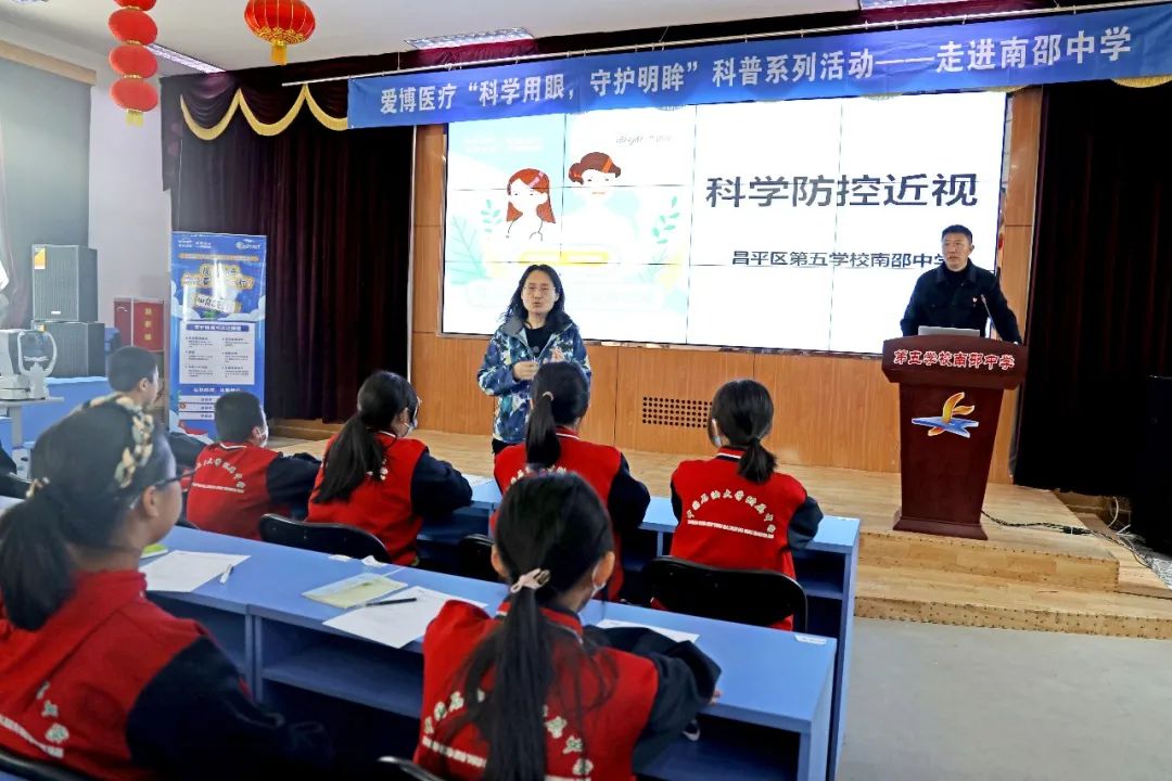 近日,爱博医疗走进昌平区第五学校南邵中学,开展“科学用眼,守护明眸”近视防控公益科普活动,以科普讲座、视力检查、户外定向运动等形式,为师生们献上一顿丰盛的“眼健康大餐”,超过120名在校师生参加了活动。活动得到了政府和校方的大力支持,旨在通过“科普进校园”提高在校学生的爱眼、护眼意识,提高眼保健知识水平,以科学的手段构筑起青少年保护视力的防线。