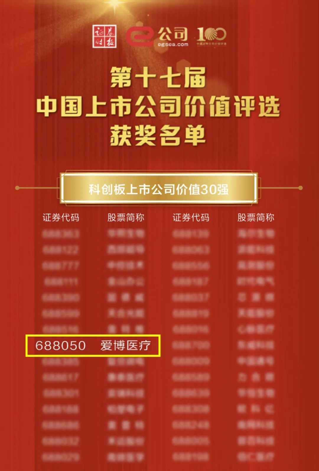 近日,在证券时报主办的2023年第17届中国上市公司价值评选活动中,经过层层遴选,爱博医疗荣获“科创板上市公司价值30强”奖项。