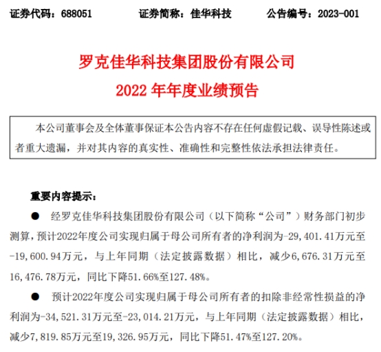 佳华科技(688051.SH)近日披露的2022年年度业绩预告显示,经公司财务部门初步测算,预计2022年年度实现归属于母公司所有者的净利润与上年同期(法定披露数据)相比,将出现亏损,实现归属于母公司所有者的净利润为-29,401.41万元至-19,600.94万元;归属于母公司所有者扣除非经常性损益的净利润为-34,521.31万元至-23,014.21万元。本次业绩预告未经注册会计师审计。