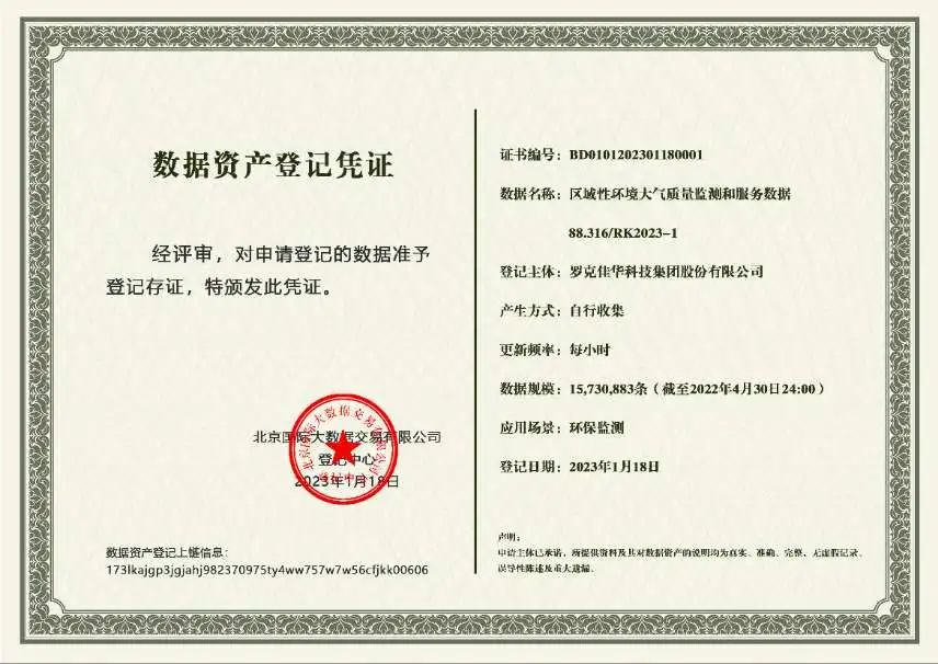 佳华科技坐拥海量的数据资源和丰富的应用场景优势,近年来我国大数据市场发展迅猛。但是,数据的经济价值还未得到深度挖掘。经过严格专业的评审,1月18日,佳华科技《环境大气质量监测和服务数据》获得北京国际大数据交易所(简称“北数所”)颁发的《数据资产登记凭证》,成为首个获得数据资产登记凭证的上市公司。