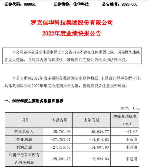 挖贝网2月28日,佳华科技(688051)发布2022年度业绩快报,公告显示,2022年度营业总收入为25,761.96万元,比上年同期下滑47.03%;归属于母公司股东的净利润为-28,201.75万元,较上年同期亏损增加。