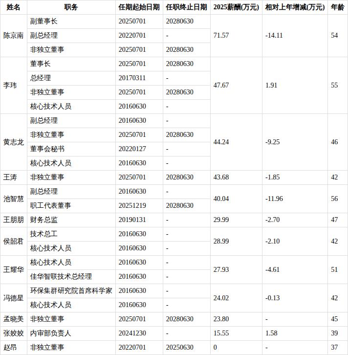 从薪酬看,董事和高级管理人员合计领取报酬397.48万元,平均薪酬36.67万元,年薪中位数为29.99万元。其中,副董事长、副总经理及非独立董事陈京南薪酬最高为71.57万元,内审部负责人张姣姣薪酬最低为15.55万元(2025年任期不满1年的不参与统计)。