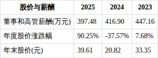 近三年董事和高级管理人员薪酬方面,2023年薪酬总额为447.16万元,2024年薪酬总额为416.90万元,2025年薪酬总额为397.48万元。从2023年到2025年,董事和高管薪酬总额减少49.68万元,降幅11.11%。