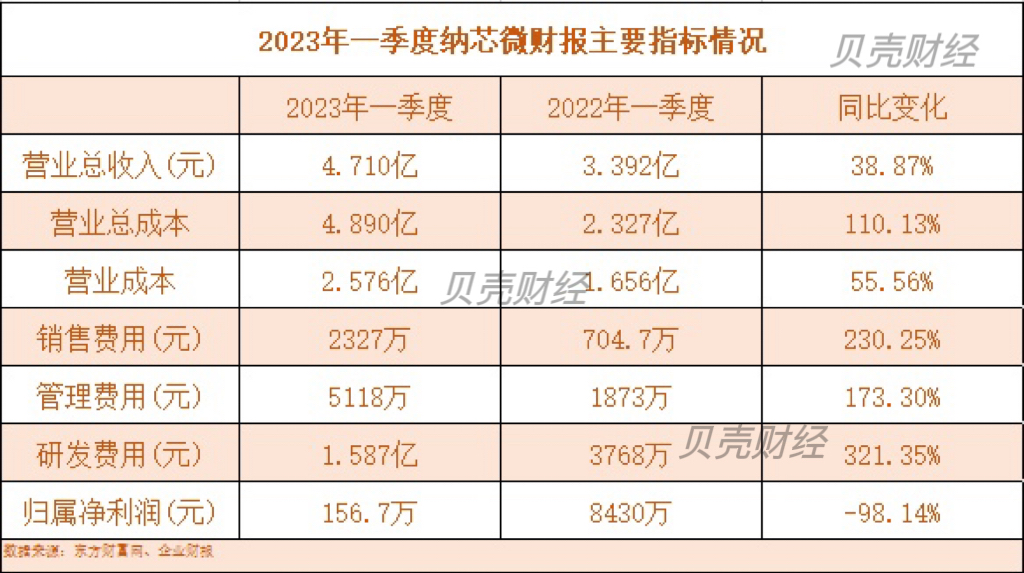 财报数据显示,纳芯微2023年一季度净利润仅156.7万元,远低于2022年一季度的约8430万元。但贝壳财经记者注意到,自2022年一季度以后,纳芯微的营业成本就大幅增加。