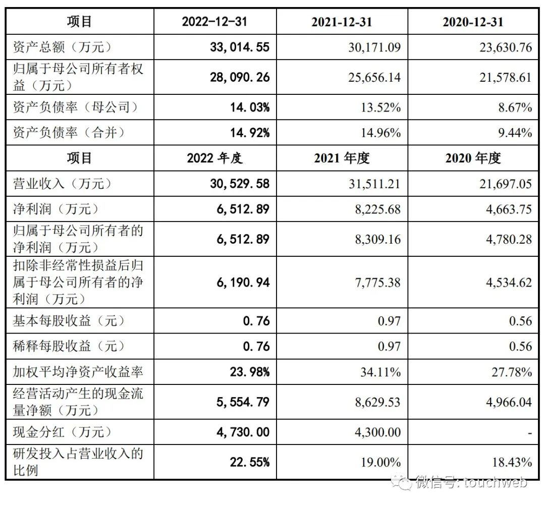 招股书显示,昆腾微2020年、2021年、2022年营收分别为2.17亿元、3.15亿元、3.05亿元;净利分别为4663.75万元、8225.68万元、6512.89万元;扣非后净利分别为4534.6万元、7775万元、6190.9万元。