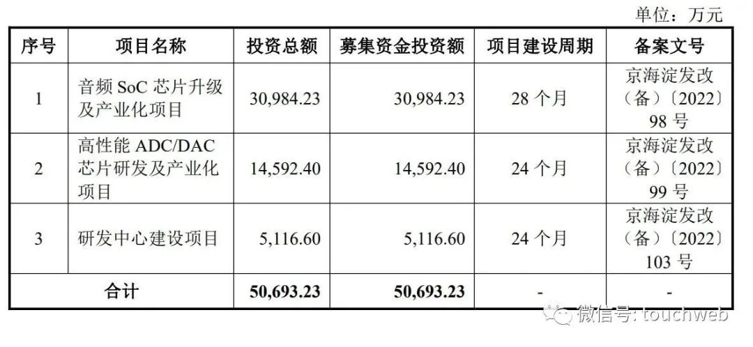 其中,3.1亿元用于音频SoC芯片升级及产业化项目,1.5亿元用于高性能ADC/DAC芯片研发及产业化项目,5116.6万元用于研发中心建设项目。