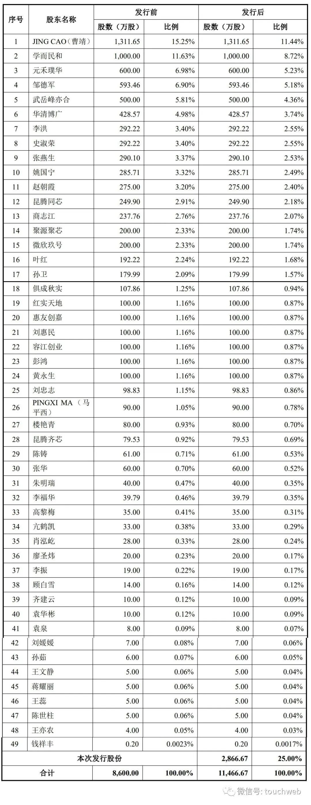 IPO后,JING CAO(曹靖)持股为11.44%,学而民和持股为8.72%,邹德军持股为5.18%,武岳峰亦合持股为4.36%,华清博广持股为3.74%,李洪、史淑荣分别持股为2.55%,张燕生持股为2.53%,姚国宁持股为2.49%,赵朝霞持股为2.4%,昆腾同芯持股为2.18%,商志江持股为2.07%,聚源聚芯、微欣玖号分别持股为1.74%;