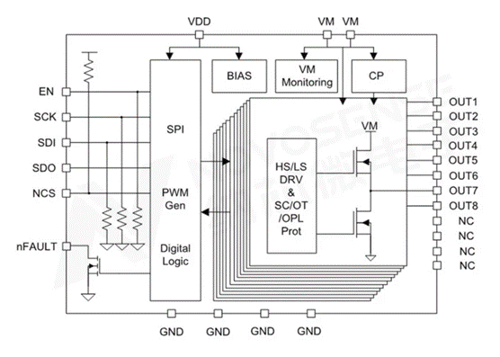 ?提供6/8/10/12通道半桥方案,该系列内置8路PWM生成器,仅通过SPI即可实现输出PWM的频率与占空比配置。