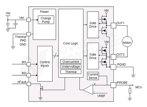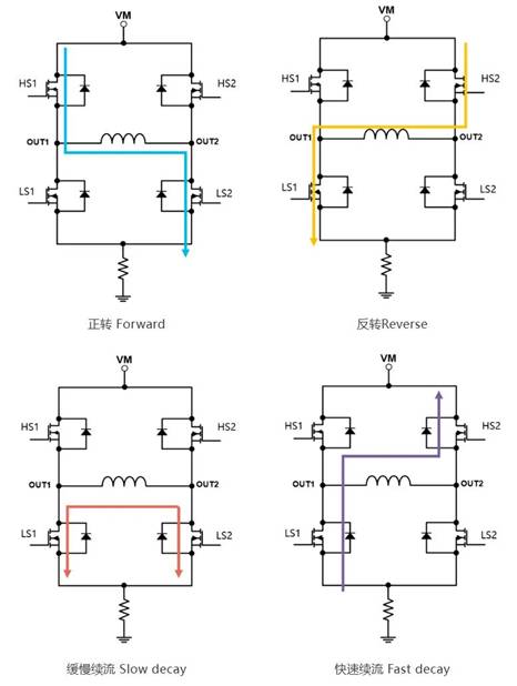 一个典型的H桥电机驱动芯片下图所示,芯片内部由四个MOS管组成H桥(HS1,HS2,LS1,LS2),芯片输出OUT1和OUT2分别连接直流有刷电机的两个电刷,芯片输入端与控制单元连接,通过控制内部MOS管的通断从而控制输出端与电机绕组中的电流大小和方向。