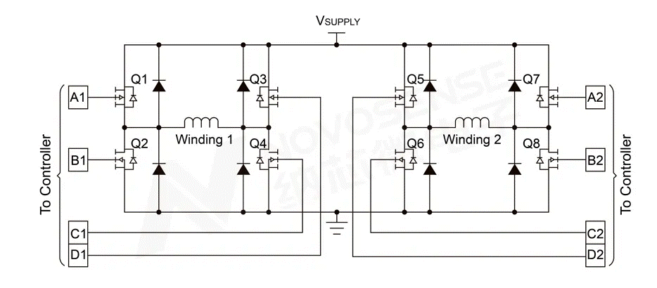 一个典型的双极性步进电机驱动芯片内置两个H桥电路(如下图所示),输出分别控制步进电机两个绕组的电流方向和大小。