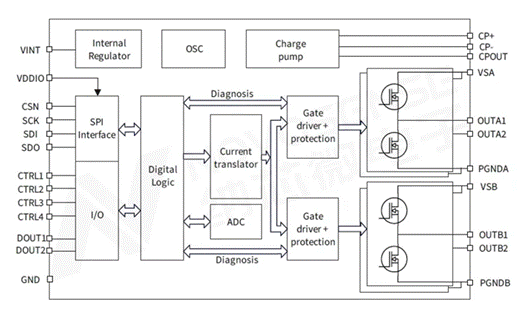 ?提供智能诊断功能,帮助车机系统判断负载连接状态,如果出现断线或者短路情况,外部MCU可以通过芯片内部寄存器,获取独立通道的报错信息。