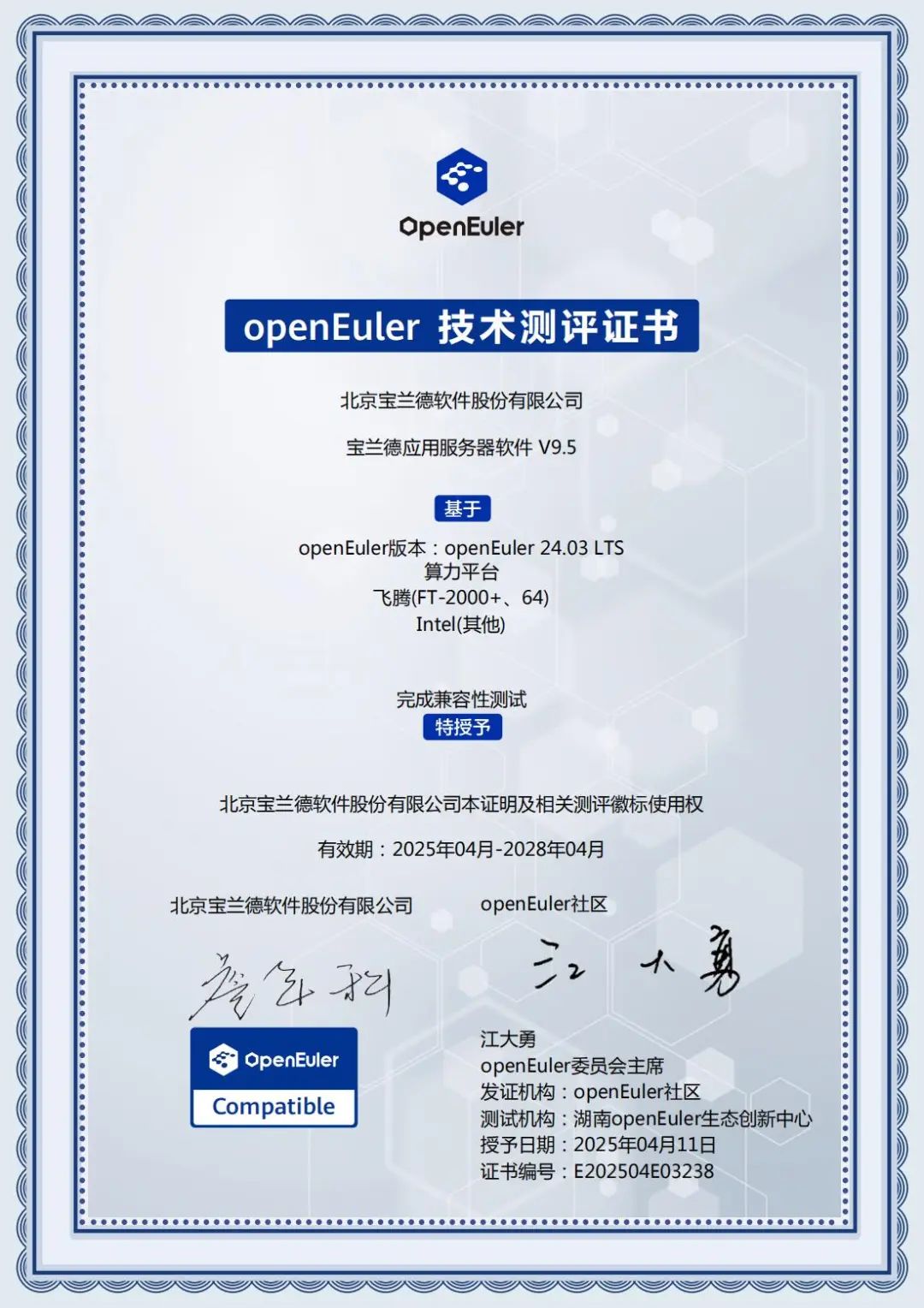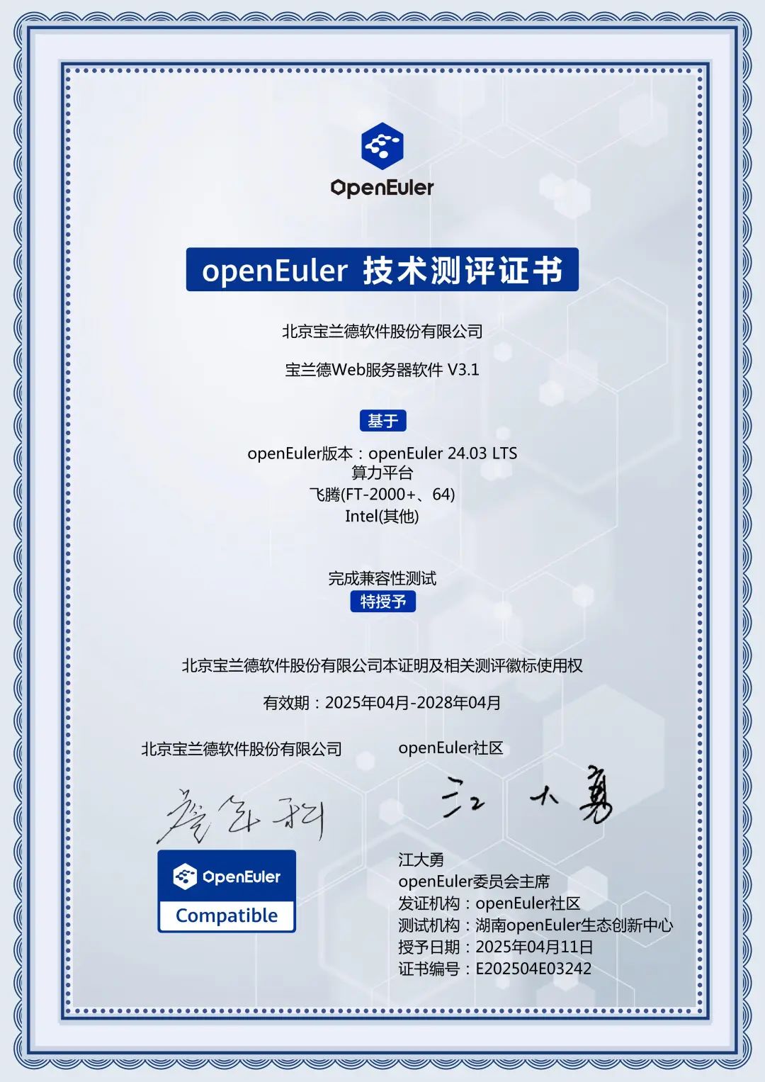 近日,宝兰德应用服务器软件、分布式缓存软件、Web服务器软件及消息中间件全线中间件产品,均通过欧拉(openEuler)技术测评,完成严格的兼容性认证,为行业用户提供了安全可靠、性能卓越的数字化基础设施选择,助力企业实现关键业务系统的自主可控。
