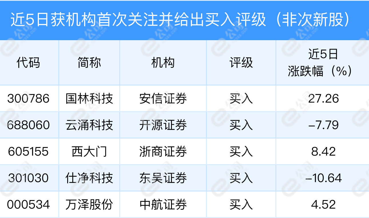 国林科技、云涌科技、西大门、仕净科技、万泽股份等在5日内获得机构首次关注并给出买入评级。