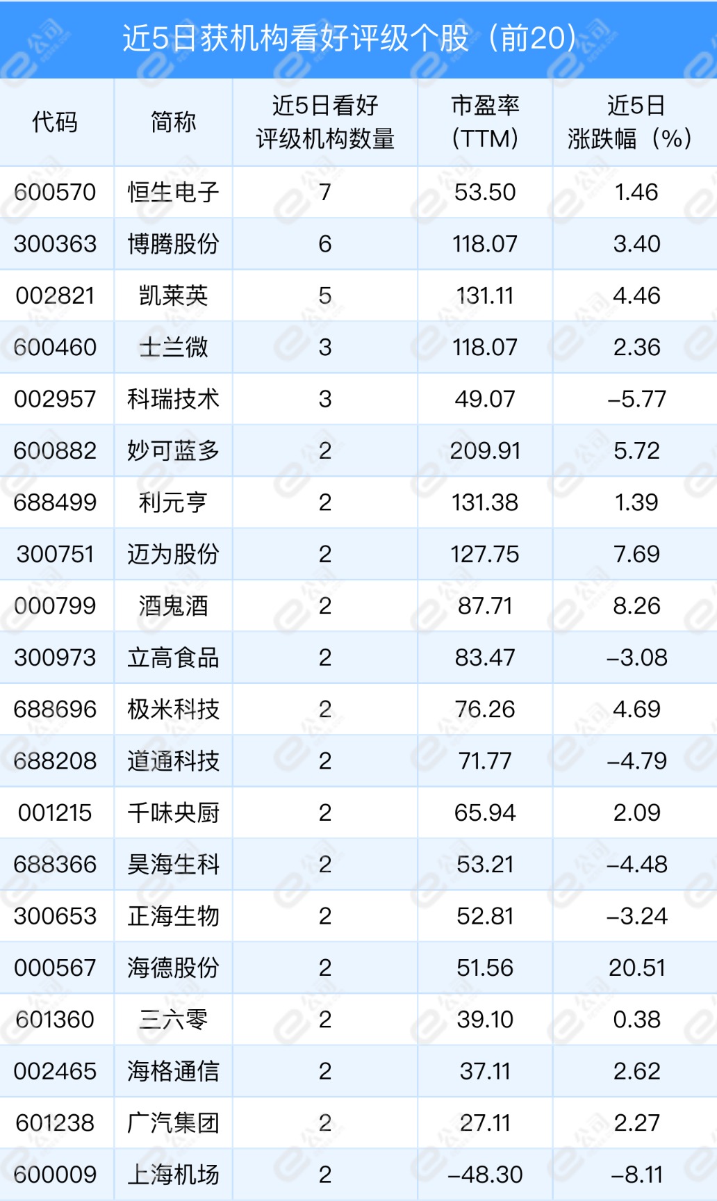 5只个股在近期被机构集中推荐,近5日内机构给予“买入”或“增持”等看好评级家数均逾3家及以上。具体来看,恒生电子(7家)、博腾股份(6家)、凯莱英(5家)等3只个股近期机构看好评级家数居前,均达到5家以上,此外,包括士兰微、科瑞技术、妙可蓝多、利元亨、迈为股份等在内的17只个股期间机构看好评级家数均在2家以上。