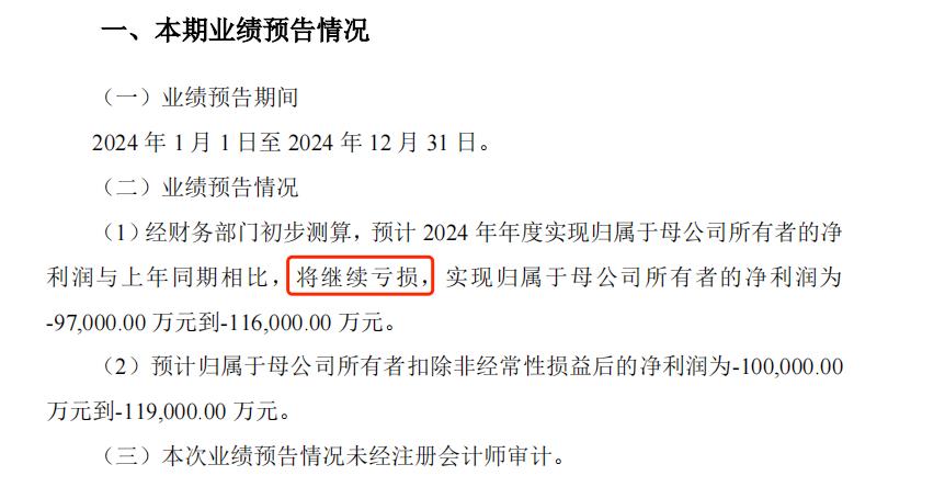 数据显示,2024年度公司归母净利润预计-9.7亿元到-1.6亿元,扣非净利润预计在-10亿元到-11.9亿元。