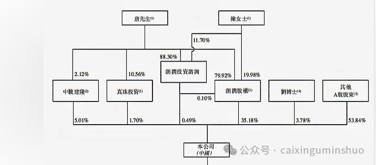 IPO前,唐春山、陈姗娜夫妇分别通过朗润股权、中骏建隆、真珠投资及朗润投资谘询拥有股份约0.49%。35.18%、5.01%、1.70%、0.49%,合共控制公司已发行股本总额约42.38%。此外,董事长刘大涛博士持股3.78%。