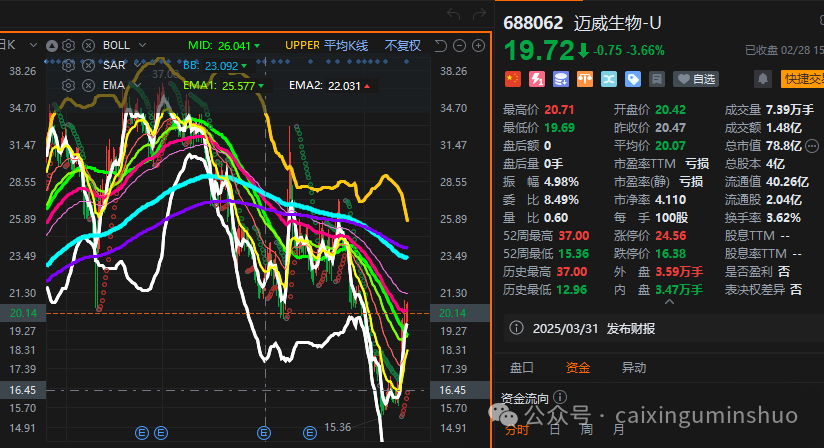 截至2025年2月28日收盘,迈威生物(688062)报收于19.72元,下跌3.66%,换手率3.62%,成交量7.39万手,成交额1.48亿元。