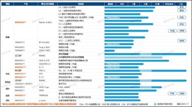 目前,9MW2821正在开展作为单药疗法及联合特瑞普利单抗治疗尿路上皮癌的III期试验;作为单药疗法治疗宫颈癌的III期试验;作为单药疗法或联合特瑞普利单抗治疗三阴性乳腺癌的II期试验。