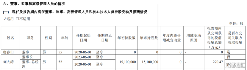 根据2024年年报,刘大涛持有公司1510万股股份,当年税前薪酬达270.47万元。
