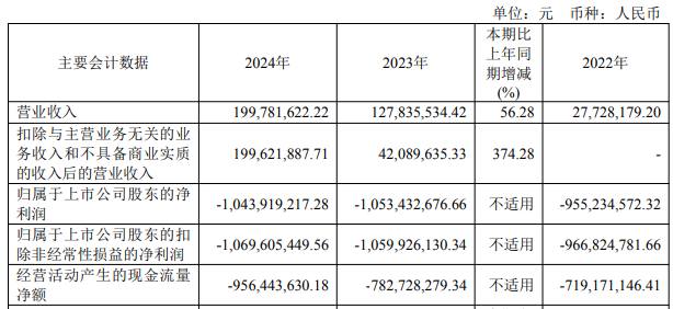 2024年,迈威生物营业收入为2.00亿元,同比增长56.28%;归属于上市公司股东的净利润-10.44亿元,上年同期为-10.53亿元;归属于上市公司股东的扣除非经常性损益的净利润为-10.70亿元,上年同期为-10.60亿元;经营活动产生的现金流量净额为-9.56亿元,上年同期为-7.83亿元。