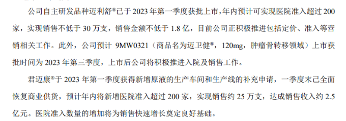 不难发现,迈利舒与君迈康的实际发货量均大幅低于2023年初设定的预期目标,其中君迈康两年累计发货量仍未达当年规划。从营收数据看,公司2023年与2024年合计营收3.28亿元,较两款产品合计4.3亿元的销售目标仍有明显缺口。