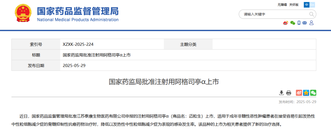 迈粒生?获批适应症为:适用于成年非髓性恶性肿瘤患者在接受容易引起发热性中性粒细胞减少症的骨髓抑制性抗癌药物治疗时,使用本品降低以发热性中性粒细胞减少症为表现的感染发生率。
