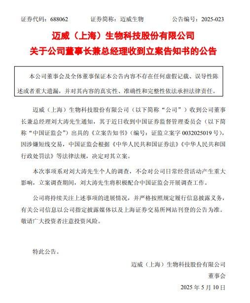2025年5月9日晚间,科创板上市药企迈威生物(688062.SH)一则公告引发资本市场震动:董事长兼总经理刘大涛因涉嫌短线交易被证监会立案调查。这份编号为“证监立案字0032025019号”的《立案告知书》在公司冲刺港股IPO的关键时刻掀起波澜。