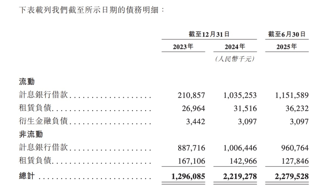 最新的港股招股书披露,2023年底,公司总债务为12.96亿元,一年后增加到22.19亿元,2025年上半年则继续爬升至22.80亿元。两年不到,债务规模几乎翻倍。