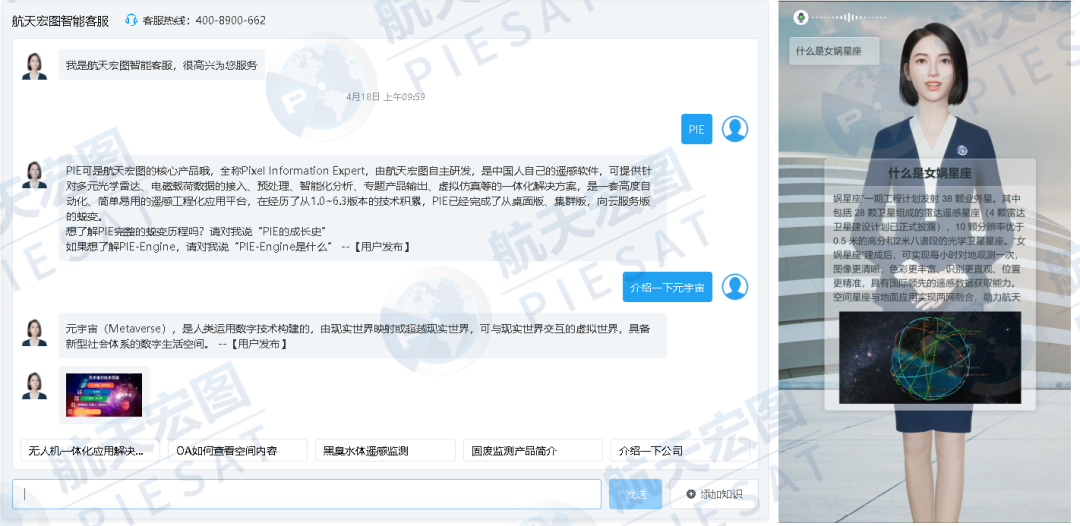 为打造全新企业形象,适应元宇宙的快速发展,2022年4月航天宏图自主研发了数字虚拟人“派安晴",赋能智慧地球大讲堂和短视频的节目制作。2023年1月研发出大屏数字人客服“小派“,在公司展厅中提供便捷的咨询服务。2023年3月进一步推出线上数字人导游“小派“,在公司官网的元宇宙展厅中精彩讲解,服务于企业品牌宣传和产品解决方案的推广。