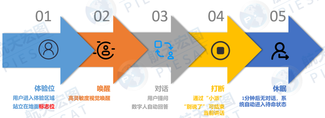 6、休眠状态:客户离开体验区后1分钟,数字人关闭监听通道并重新进入待机状态;