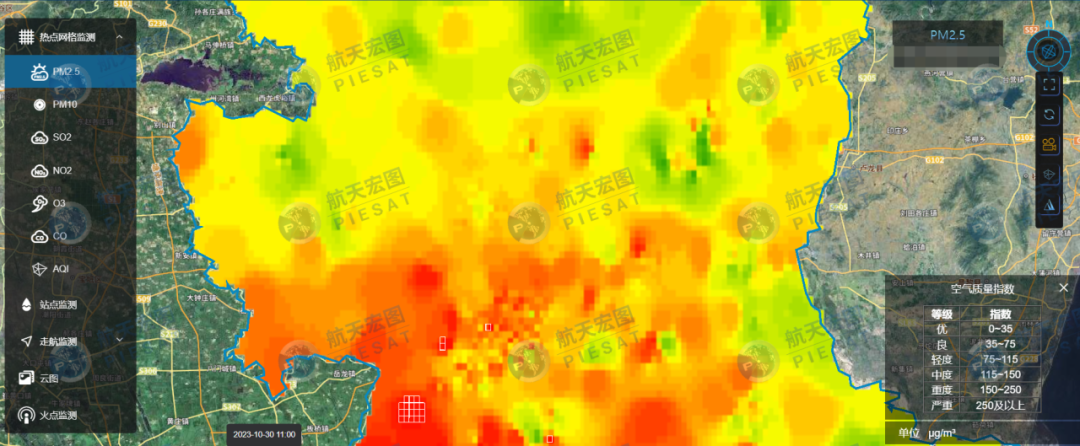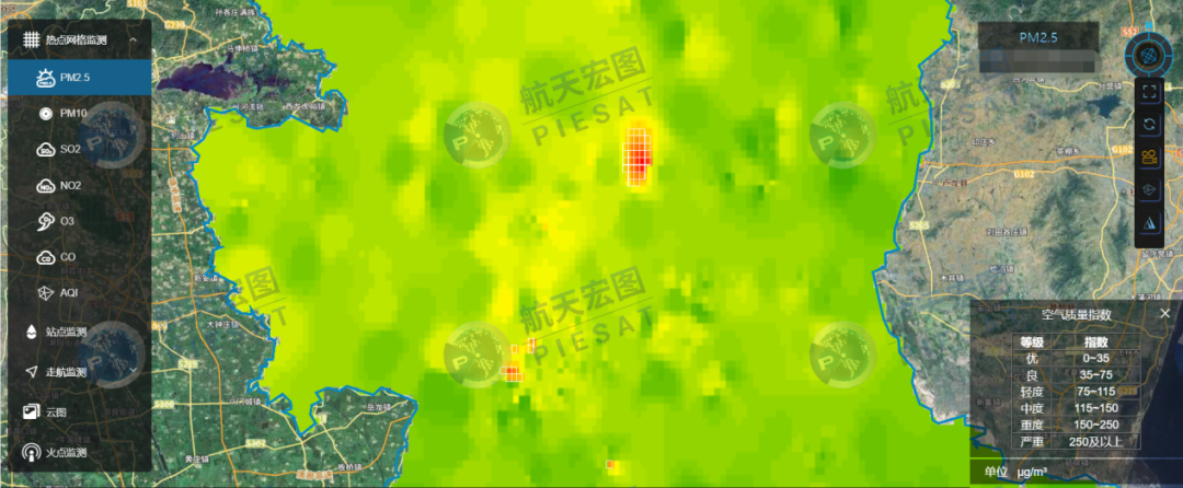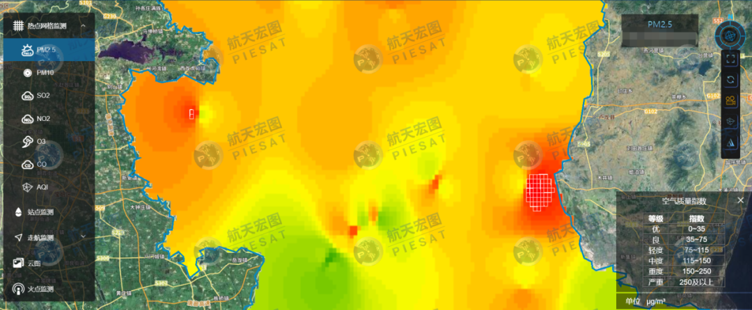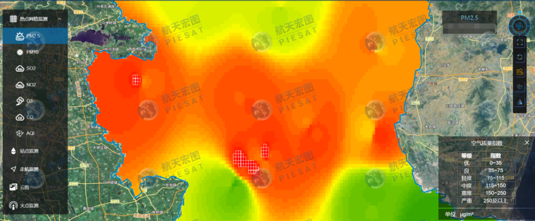 航天宏图依托自主研发的时空遥感云服务平台PIE-Engine,建立“天空地一体化”大气污染智慧管控平台,基于卫星遥感、无人机航拍、空气质量地面观测、气象观测等数据,实现细颗粒物(PM2.5)、氮氧化物(NOX)、臭氧(O3)等污染物浓度的计算,形成1x1公里的网格计算结果,将污染物浓度超过一定阈值的网格区域设定为“热点”网格,生成区域大气污染“热点”分布图,可辅助环保部门对热点网格区域内的相关企业进行重点督查,以数据为依据,有的放矢,真正做到差异化管控。