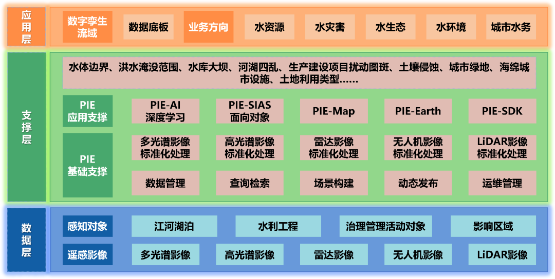 基于自主研发的PIE系列产品,航天宏图构建了水利遥感全链条智能服务体系,依托PIE-Engine遥感云计算服务平台形成国产化技术矩阵,实现对光学、雷达、高光谱等各类遥感数据的自动化预处理、标准化治理及批处理,完成自动识别和智能解译,并根据需要生成水利专题图件,满足智能识别分析需求。