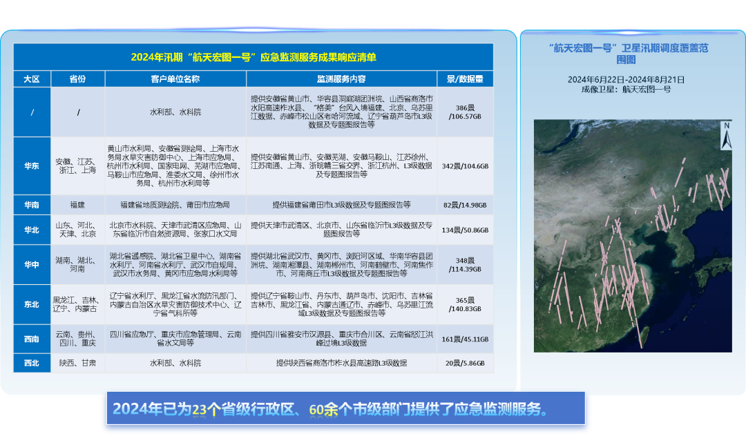 “宏图一号”初露锋芒,应急支撑全天候防汛安全。2024年汛期,“宏图一号”在全国累计开展应急监测300余次,交付数据达6000余景,覆盖范围涵盖北京、上海、辽宁、湖南等23个省、直辖市、自治区,支持保障了全国汛期的多项应急监测任务。