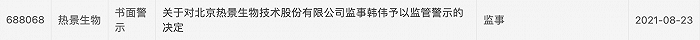 8月23日,上交所对热景生物监事韩伟予以监管警示,经查明,韩伟于2017年8月28日至2021年8月16日担任热景生物监事。2021年8月12日,公司披露公告称,韩伟的配偶于2021年3月12日至4月20日期间,陆续买入公司股票18000股,买入金额合计90.61万元;后于4月20日,卖出公司股票3000股,卖出金额42.95万元。公司时任监事韩伟的配偶所持有的公司股票在6个月内被买入又卖出的行为,构成短线交易的违规行为。根据公司公告,上述交易产生的收益将上缴归公司所有。鉴于上述违规事实和情节,上交所根据规定对北京热景生物技术股份有限公司时任监事韩伟予以监管警示。
