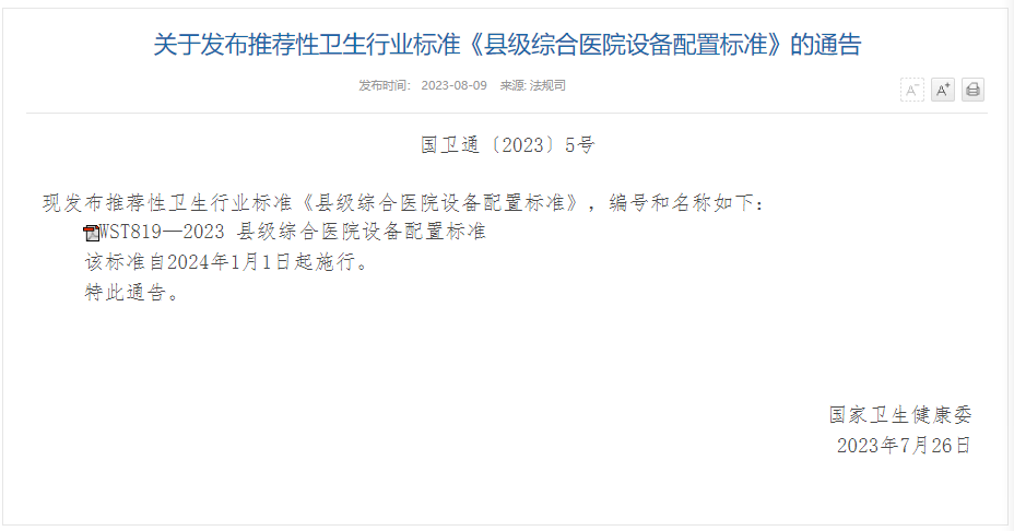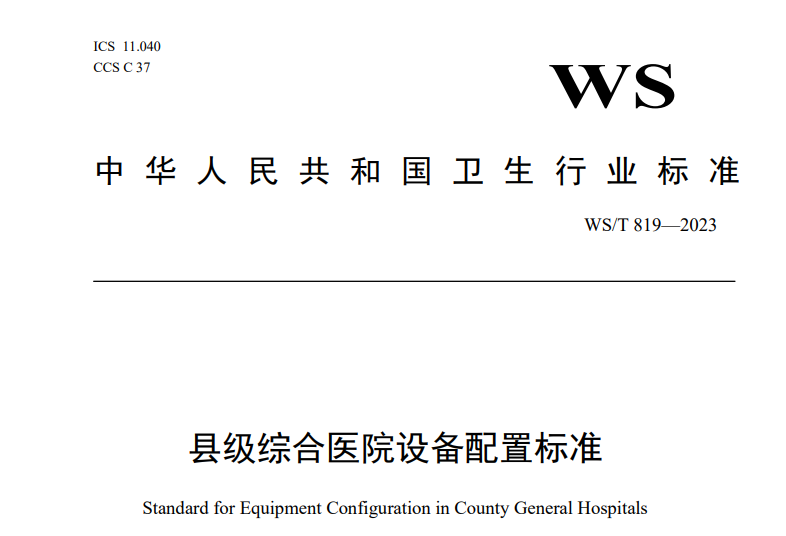 2023年8月,国家卫健委发布WS/T 819—2023《县级综合医院设备配置标准》。标准规定了设备配置数量的最低标准,各县级综合医院可根据规模和服务需求合理配置,于2024年1月1正式实施。一部分仪器设备将是配置重点!