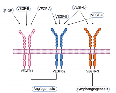 人体中VEGF家族包括VEGF-A、VEGF-B、VEGF-C、VEGF-D和胎盘生长因子(PIGF)等。VEGF-A通常被称为VEGF,是人体血管生成的必需蛋白质,调节血管内皮细胞的分化和生长发育。VEGF-B主要在心脏及骨骼肌肌肉组织中表达,主要参与心脏血管的生成。VEGF-C、VEGF-D都可以促进淋巴内皮血管的生成,从而促进淋巴管的生成。VEGF-E促进内皮血管的有丝分裂,增强血管的通透性,VEGF对应着三种类型的VEGF受体,以不同的亲和力和特异性结合引起不同的反应,用来参与调控血管生长发育与淋巴管的生长发育。