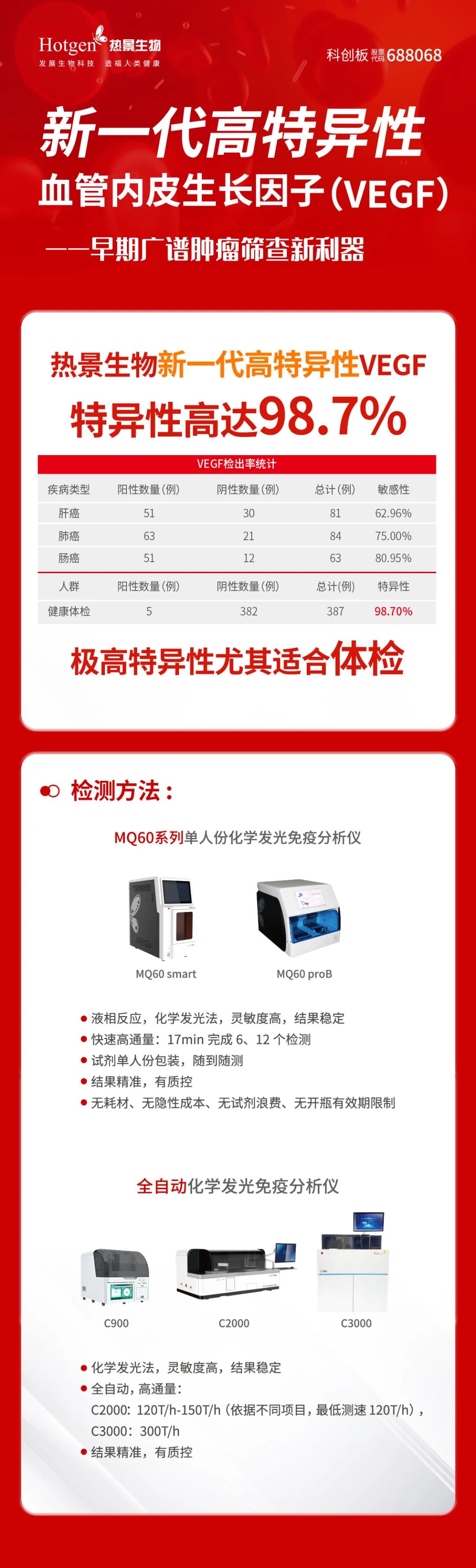 没有任何的标记物或手段可以将肿瘤100%检出,VEGF相比与其他传统肿瘤标记物其灵敏度要高,其综合检出率在60%-70%。而热景VEGF检测试剂作为新一代高特异性标记物,特异性高度98.7%。