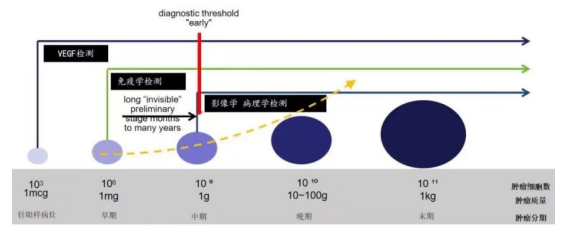 VEGF在肿瘤病灶早期(Ti0和1期)呈现高水平表达,在肿瘤的发生发展中持续高表达,而其他传统肿标或影像学要当肿瘤大小>1cm或肿瘤细胞达百万数量级以上(中晚期)才能检测到。