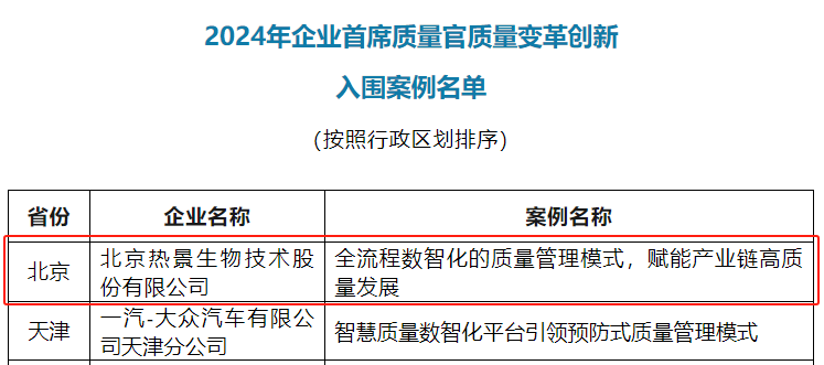 近日,2024年企业首席质量官质量变革创新典型案例征集活动评审结果发布,热景生物《全流程数智化的质量管理模式,赋能产业链高质量发展》入选2024年企业首席质量官质量变革创新入围案例名单,成为北京市以及体外诊断领域唯一入选企业。