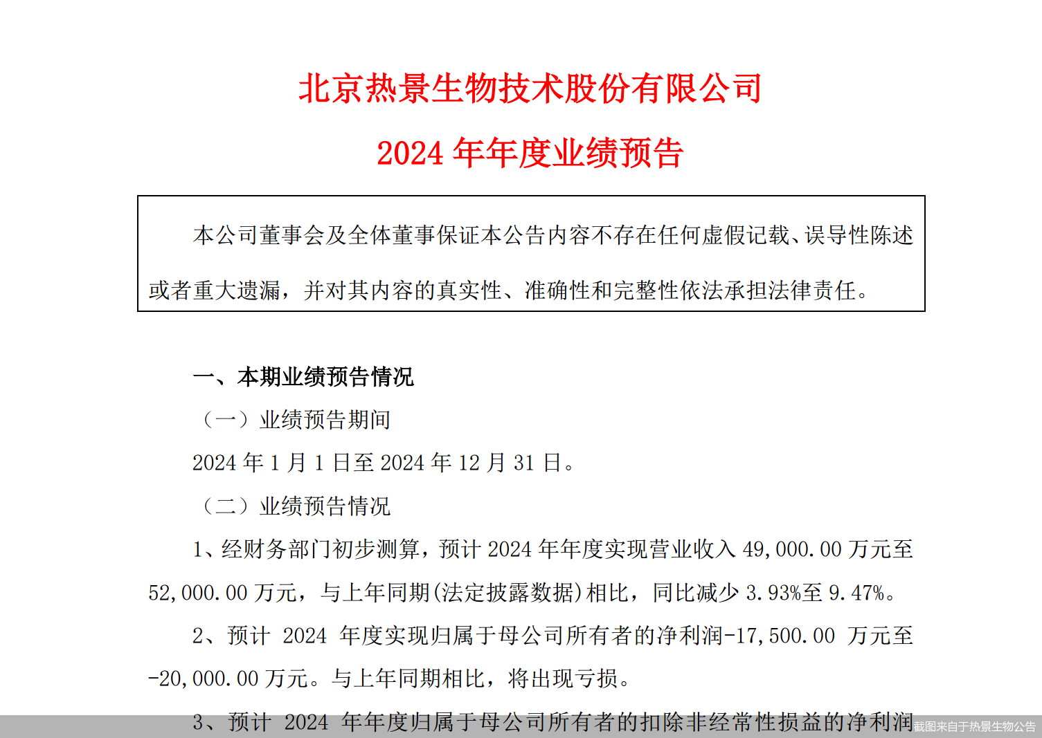 1月15日,热景生物发布2024年业绩预告显示,公司预计2024年实现营业收入4.9亿元至5.2亿元,与上年同期(法定披露数据)相比,同比减少3.93%至9.47%;对应实现的归属净利润预计约为-1.75亿元至-2亿元,同比由盈转亏;预计2024年实现的扣非后净利润为-2.4亿元至-2.65亿元。