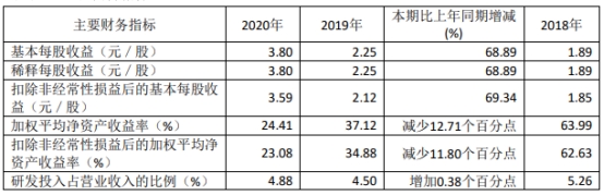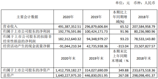 2020年年报显示,德林海实现营业收入4.91亿元,同比增长65.52%;实现归属于上市公司股东的净利润1.93亿元,同比增长91.96%;实现归属于上市公司股东的扣除非经常性损益的净利润1.82亿元,同比增长93.23%;经营活动产生的现金流量净额为-9104.42万元,同比减少313.04%。基本每股收益3.80元/股,同比增长68.89%。加权平均净资产收益率24.41%,同比减少12.71个百分点。