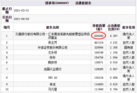 截至今年一季度末,交通银行股份有限公司-汇丰晋信低碳先锋股票型证券投资基金位列德林海第一大流通股东,其持股数量为62.63万股,占流通股比例为4.387%。该基金的现任基金经理是陆彬。
