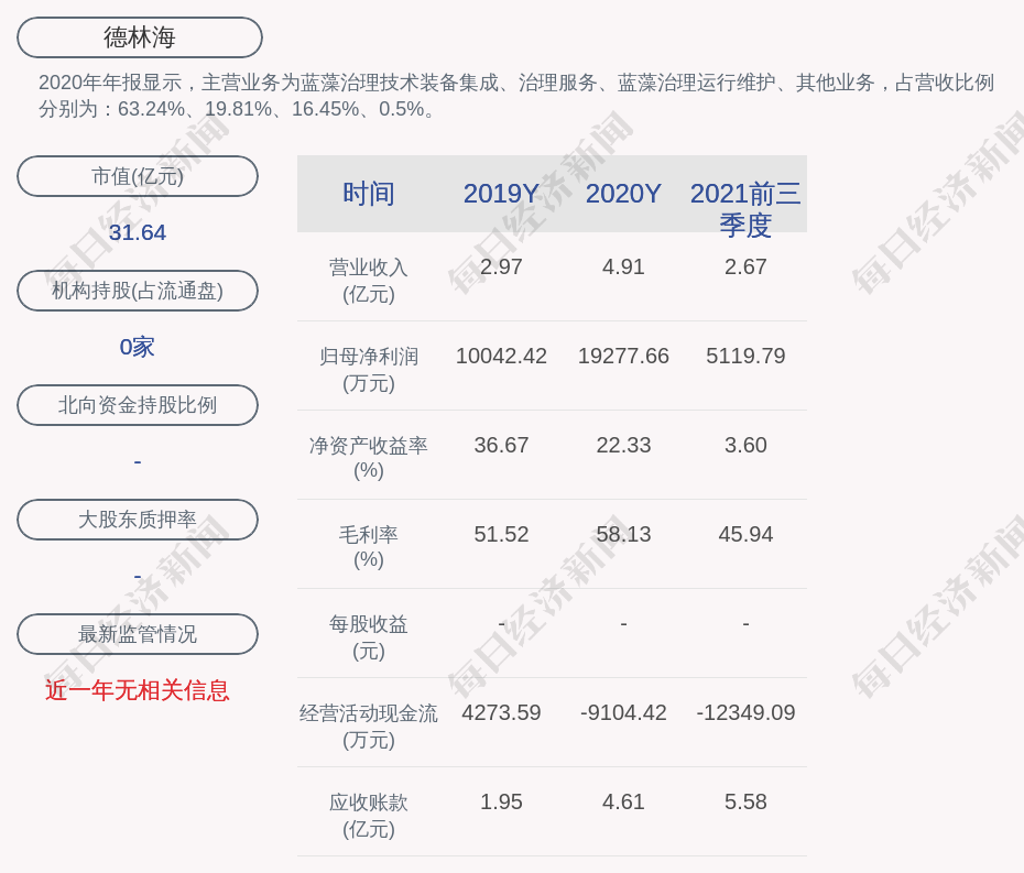 2020年年报显示,德林海的主营业务为蓝藻治理技术装备集成、治理服务、蓝藻治理运行维护、其他业务,占营收比例分别为:63.24%、19.81%、16.45%、0.5%。