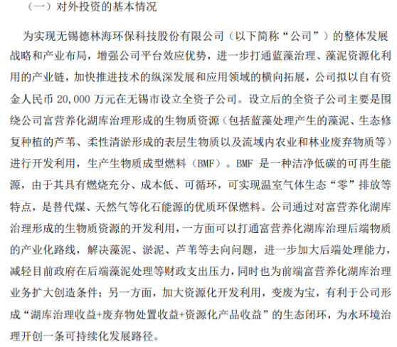 设立后的全资子公司主要是围绕公司富营养化湖库治理形成的生物质资源(包括蓝藻处理产生的藻泥、生态修复种植的芦苇、柔性清淤形成的表层生物质以及流域内农业和林业废弃物质等)进行开发利用,生产生物质成型燃料(BMF)。BMF是一种洁净低碳的可再生能源,由于其具有燃烧充分、成本低、可循环,可实现温室气体生态“零”排放等特点,是替代煤、天然气等化石能源的优质环保燃料。公司通过对富营养化湖库治理形成的生物质资源的开发利用,一方面可以打通富营养化湖库治理后端物质的产业化路线,解决藻泥、淤泥、芦苇等去向问题,进一步加大后端处理能力,减轻目前政府在后端藻泥处理等财政支出压力,同时也为前端富营养化湖库治理业务扩大创造条件;另一方面,加大资源化开发利用,变废为宝,有利于公司形成“湖库治理收益+废弃物处置收益+资源化产品收益”的生态闭环,为水环境治理开创一条可持续化发展路径。