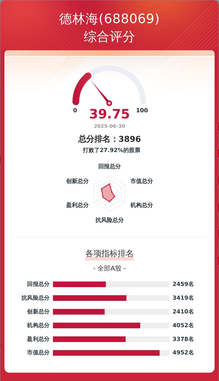 金融界上市公司研究院构建了一套上市公司韧性评价体系,从企业盈利、科技创新、股东回报、经营抗风险、市值表现及机构吸引力六个维度对企业进行量化评分,满分为100分。德林海的韧性评价总分为39.75分,在A股5405家可比上市公司中排名第3896位。