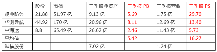 我们选取有垂直起降固定翼无人机的上市公司作为估值参看,它们是观典防务、中海达、华测导航,其中观典防务在新三板上市,并与10月20日停牌筹备转板事宜,我们采用当天收盘数据,财务数据采用三季报数据。中海达和华测导航采用11月19日收盘数据,财务数据也采用三季报数据。